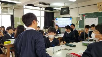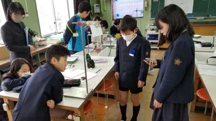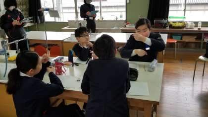 本日1時間目、5年1組で理科の研究授業を行いました。単元は「ふりこのきまり」です。「ふりこが1往復する時間は、おもりの重さを変えると変わるのだろうか」という問題について、各班で話し合い、実験をして実証します。