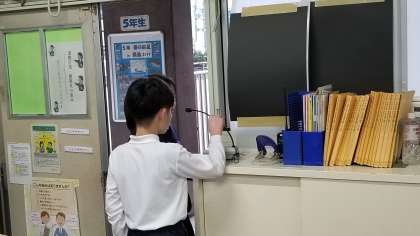 本日は運動場の状態が悪く、児童朝会はありません。児童の代表が「あいさつ週間」について放送をしました。
