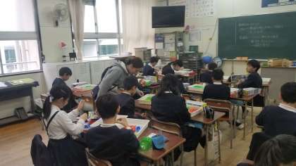 1組は、理科で電気と磁石の学習キッドを使って学習していました。2組は図工です。色のついた針金で創作活動です。