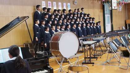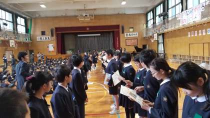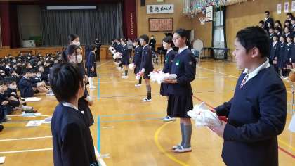 在校生から卒業生に、贈る言葉や歌と色紙のプレゼントがありました。卒業生からも、合唱・合奏と雑巾のプレゼントがありました。