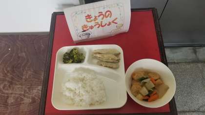 今日の給食は、きびなごのてんぷら、一口がんもとじゃがいもの煮もの、ブロッコリーのごまあえ、ごはん、牛乳です。しっかり食べましょう。