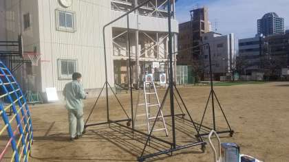 管理作業員さんが、防球ネットの塗装と、ネットの張替えを行っています。