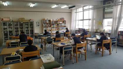 写真下は、図書室での自習の様子です。アルコール消毒・検温・定期的な換気・互いの距離の確保などを行い活動しています。
