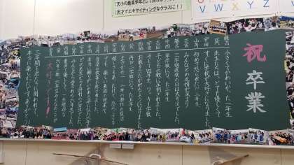 6年2組のメッセージです。入学からかかわった先生方の一言が伝えられました。