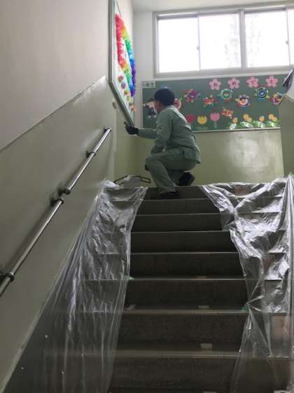 管理作業員さんが放送室横の3号階段を塗装しています。皆さんの登校再開を願って、全力で受け入れ準備をしています。