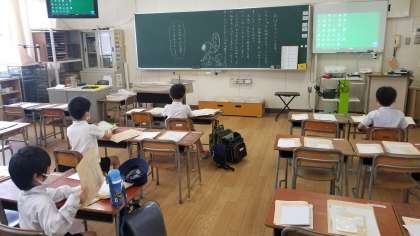 登校後の教室の様子です。久しぶり学校です。進級して新しい教室です。