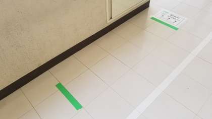 トイレや手洗い場等、子どもたちが密集や密接しやすい場所には、テープで一定の距離を保てるようにしています。