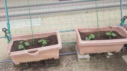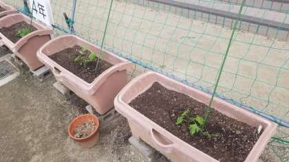 保健室前にへちまとゴーヤを植えました。成長すれば実を収穫することもできます。また、緑のカーテンとしても活用できます。学校が始まれば4年生の子どもたちがお世話をしてくれる予定です。
