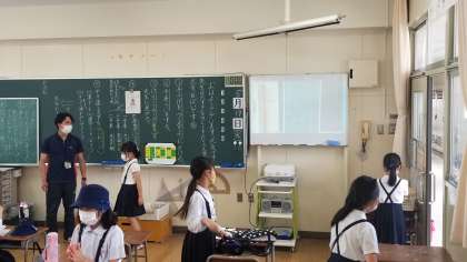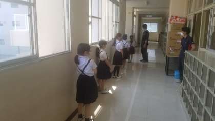 午後登校の児童の様子です。登校後は健康観察・手洗い・消毒といった習慣をつけることが大切です。
