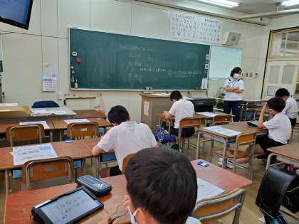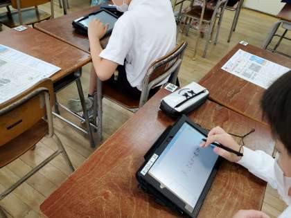 課題の回収や新しい課題の説明をしたあと、タブレット端末を使ったインタビューゲームをしました。