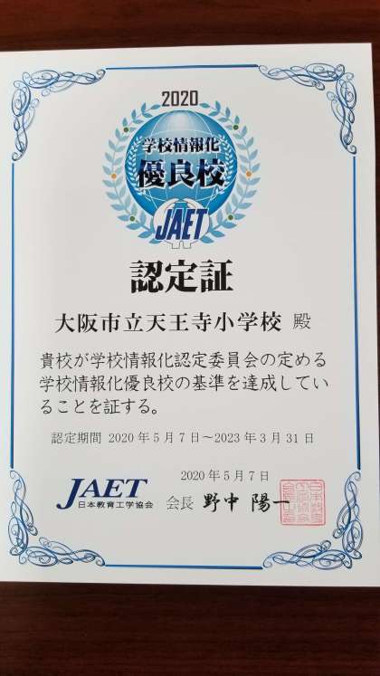 天王寺小学校が、日本教育工学協会(JEAT)より、優良校として認定証をいただきました。日本教育工学協会は、教育工学に関する研究活動の交流・協力と情報交換並びに成果の普及を目的とした団体です。天王寺小学校のICTを活用した教育実践に対する評価です。