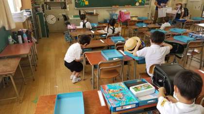 登校後の手洗いの様子と1年生の様子です。1年生は教材等の整理だけでも時間がかかります。ゆっくり学校生活に慣れてきます。
