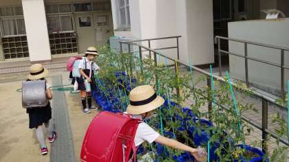 2年生は登校後すぐに、トマトの水やりをしています。「たくさん実がついてきたよ」と教えてくれました。緑の実がたくさんついていました。
