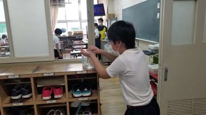 休憩後、教室に入る前は消毒をしています。