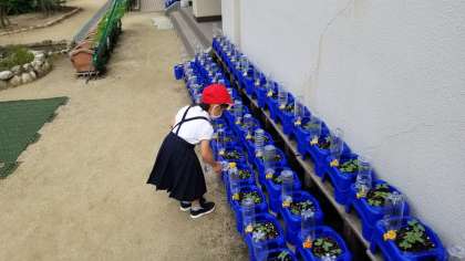 1年生が朝顔に水やりをしています。毎日、大切に育てています。
