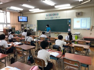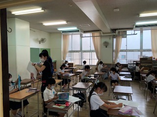 午前中の高学年のようすです。上段は6年生、国語の授業です。下段は4年生、ノートを配っていました。