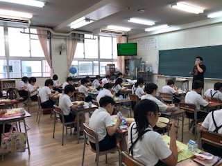 久しぶりの全員での給食ですが、飛沫による感染を防ぐため、みんな前を向いて無言で食べています。おかわりするときも間隔をあけて並んでいます。