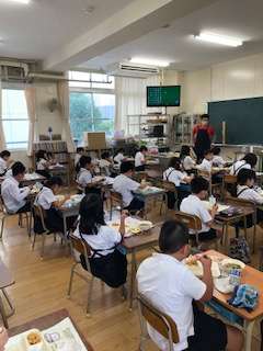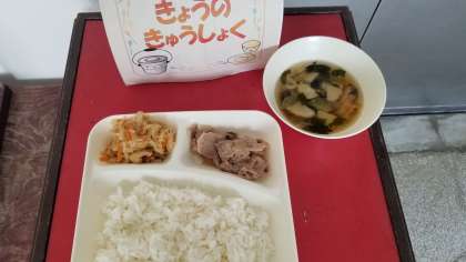 今日の給食は、豚肉の甘辛焼き、すまし汁、切干だいこんのいため煮、ごはん、牛乳です。しっかり食べましょう。