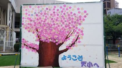 例年、2年生が歓迎の言葉や演奏、歌などを披露するのですが、本日は規模縮小しての入学式でした。かわりに、在校生全員の心がこもったメッセージが書かれた桜の花で新入生を歓迎しました。