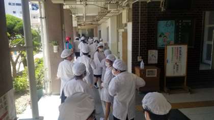 給食係の児童です。密集を避けて、一定の間隔で並んでいます。