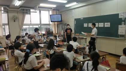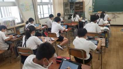 下は、6年生の調べ学習の様子です。タブレットを活用しています。