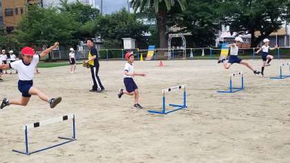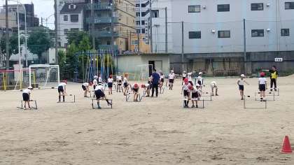 5年生の体育の様子です。ハードル走です。皆で準備をしています。先生のお話をしっかり聞いてハードリング頑張りましょう。