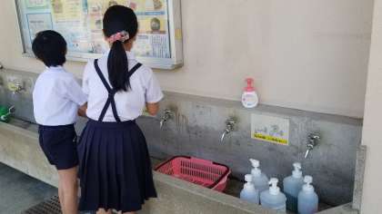 保健委員会の児童が石鹸の確認と補充を行っています。