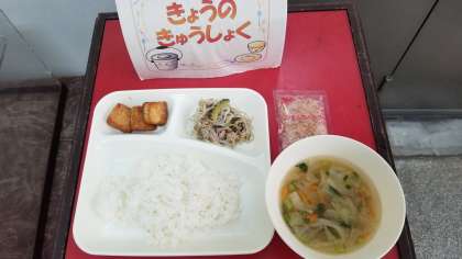 今日の給食は、ゴーヤチャンプルー、すまし汁、あつあげのしょうがじょうゆかけ、ごはん、牛乳です。しっかり食べましょう。
