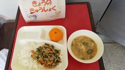 今日の給食は、豚ミンチとニラのそぼろ丼、オクラのみそ汁、みかん(冷)、牛乳です。