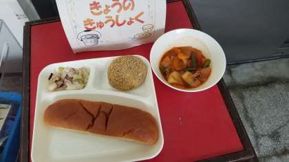今日の給食は、チキンレバーカツ、ケチャップ煮、たことキャベツのバジルソテー、パン、牛乳です。しっかり食べましょう。