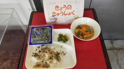 今日の給食は、豚肉とじゃがいもの煮もの、オクラの梅風味、ツナっ葉いため、ごはん、牛乳です。しっかり食べましょう。