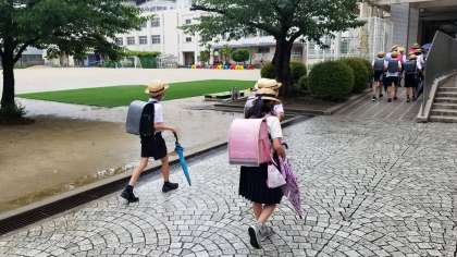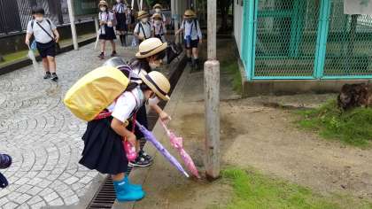 子どもたちが昨日からの激しい雨でできた水たまりを観察しています。