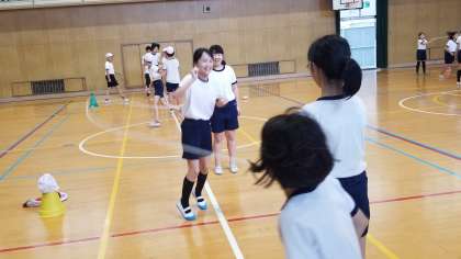 6年生の体育の様子です。縄跳びを使った運動です。長縄のリズムや跳ぶ人数を変えたりして巧みに体を動かしていました。