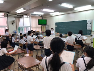 5−2の国語の学習です。学級全員で詩を朗読していました。順番を決めないで一行ごとに誰かが立って朗読していました。「タケノコ読み」と言い、きれいな朗読を途切れさせないようにするには、自分が読みたいところだけでなく誰も読まないなと思った行の時にさっと立って朗読しなければなりません、学級全員がしっかりと聞いていることとどの行でもしっかり読めることが求められます。このときはもちろん、きれいな朗読が最後まで途切れずに続いていました。