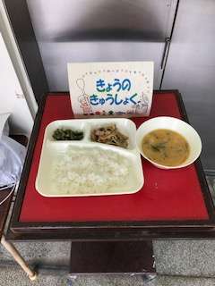 今日の献立は、豚肉の生姜焼き、みそ汁、さんど豆の胡麻和え、ご飯、牛乳でした。おいしくいただきました。