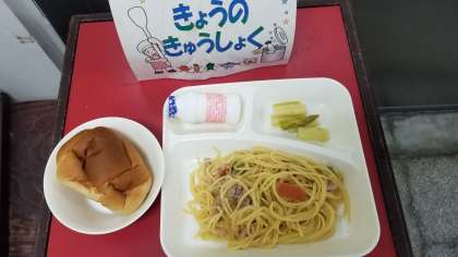 今日の給食は、ポークトマトスパゲッティ、グリーンアスパラガスのサラダ、発酵乳、パン、牛乳です。しっかり食べましょう。