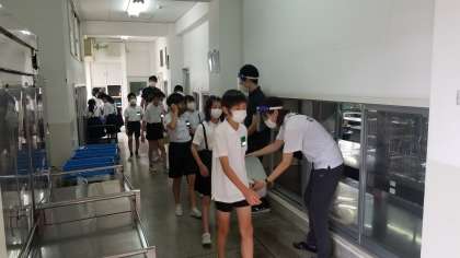 食器等を返却する様子です。給食委員に対して、「ごちそうさまでした。給食おいしかったです。」と言って返却します。教室に戻るときも、一人一人が「ごちそうさまでした。給食おいしかったです。」と調理人さんや栄養教諭の先生にあいさつをします。