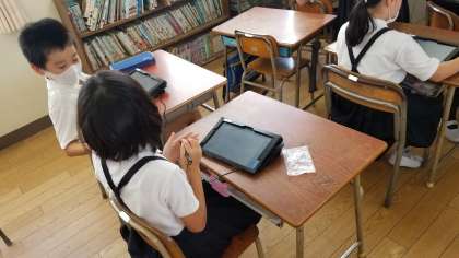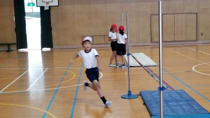 4年生は、体育館んで走り高跳びです。素晴らしい踏切です。