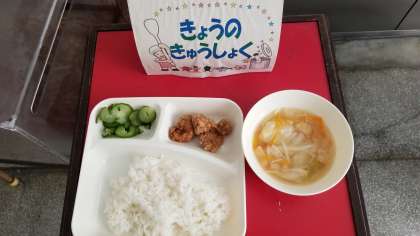 今日の給食は、豚肉の香味あげ、すまし汁、あっさりきゅうり、ごはん、牛乳です。しっかり食べましょう。