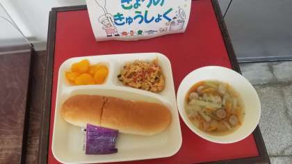 今日の給食は、パエリア、ウインナーとキャベツのスープ、みかん(缶)、パン、牛乳です。しっかり食べましょう。