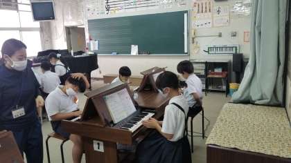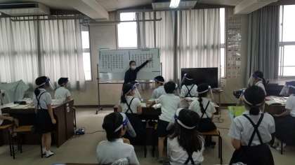3年生の音楽の様子です。歌うときはフェースシールドを着用しています。