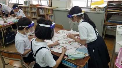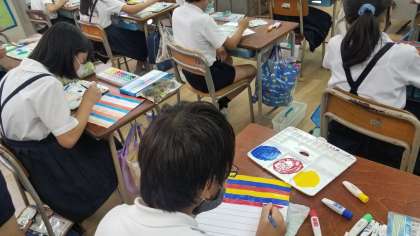 1組は図工です。帯状に色を重ねています。塗り終えると、次は縦に切り、模様を作り出していきます。