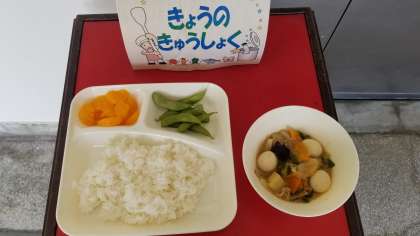 今日の給食は、八宝菜、えだまめ、みかん(缶)、ごはん、牛乳です。しっかり食べましょう。