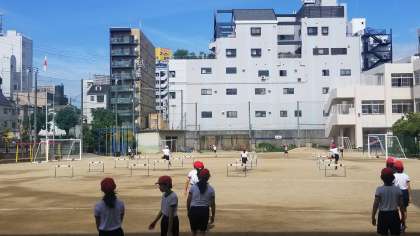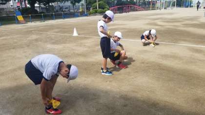 5年生の体育の様子です。今日も踏切足にバンダナを巻いていました。同じ距離をハードルがある場合とない場合の速さを比べて、効率的にハードルを跳び越えているかを確認します。
