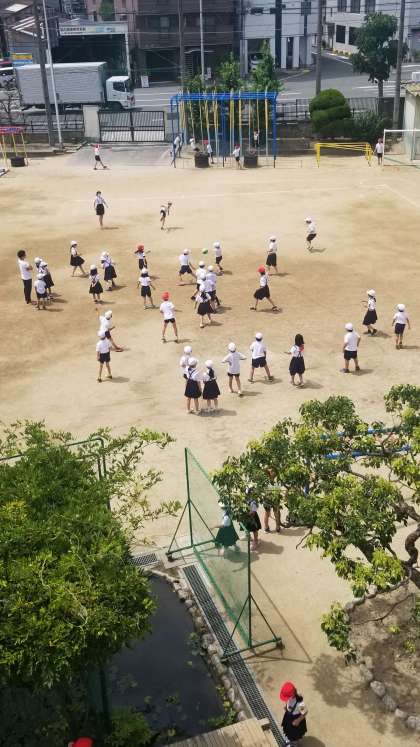 運動場で活動する場合は、熱中症対策として、事前に水分補給をさせ、状況に応じてマスクを外すように指導しています。
