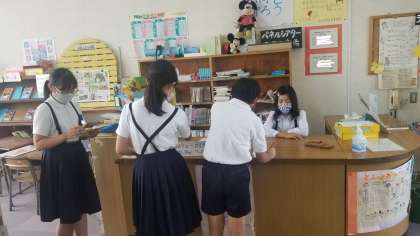 図書館の様子です。現在図書館のクーラーが故障しています。暑い中、たくさんの児童が本を読んでいました。