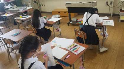 2年生の教室の様子です。図工の続きをしているのでしょうか。はさみを上手に使って画用紙を切っていました。
