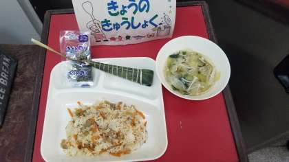 今日の給食は、きんぴらちらし、すまし汁、ちまき、牛乳です。しっかり食べましょう。
