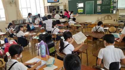 「ランドセルをおいて、手洗い、消毒。健康カードを先生に見せる。にもつを机にしまう。」等、皆がわかるように指示がでています。その指示を見て、各自が行動しています。