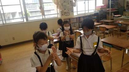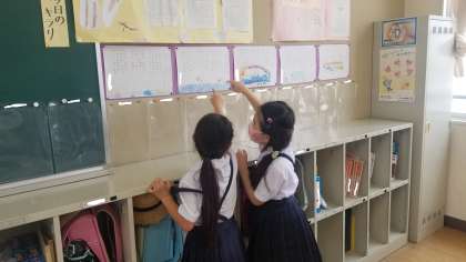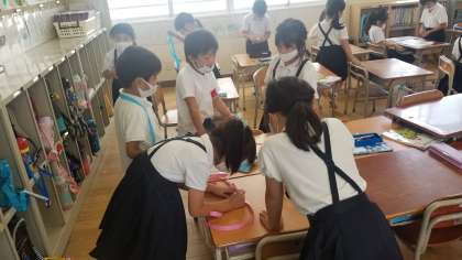 1・2年生の様子です。1年生は算数の学習の続きをしている児童がいました。2年生は友だちの掲示物を見たり、あやとりをしていました。